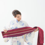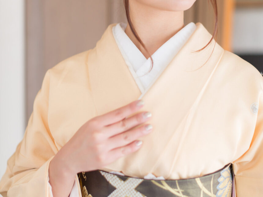 長襦袢の衿の上に縫い付ける長さ1メートル、幅15センチくらいの衿。本来の衿の半分くらいの長さなので、「半衿」と呼ばれる。衿もとの形を整え、その汚れを防ぐものとして付けられていて、基本は白色。明治時代以降、おしゃれを目的に着物とコーディネートして楽しむ半衿も生まれている。素材は、夏物の着物には絽や麻、冬物には縮緬(ちりめん)や塩瀬(しおぜ。厚手の羽二重)を使う。刺繍入りやレースなどのものもあり、TPOに応じて選ぶ楽しさがある。