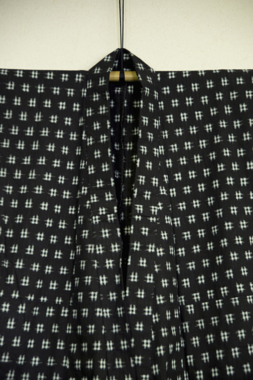 経糸(たていと)や緯糸(よこいと)、あるいはその両方を部分的に染め、それを織り上げることで模様を表わした織物。歴史は古く、起源はインドとされている。日本でも法隆寺の宝物に経絣(たてかすり)がある。江戸時代以降、木綿の普及とともに絣が庶民の着物として全国に広がっていった。模様には十字や井桁、田の字、矢絣などがあり、琉球絣には流水やツバメのように特徴的な柄もある。色はおもに紺や白。糸も当初は木綿で織られていたが、絹、麻などでも絣が作られるようになった。綿では久留米絣や伊予絣など、絹は琉球絣、結城紬、大島紬、麻は越後上布(小千谷縮)、能登上布などがよく知られている。