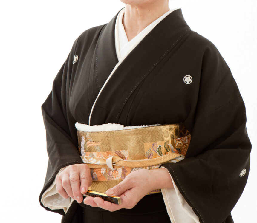 「留袖」は既婚女性が着るも格式の高い着物で、振袖の長い袖を短くしたもの。裾だけに華やかな模様があしらわれていて、地色が黒のものを「黒留袖」という。縮緬(ちりめん)の生地で、模様は縁起のよい吉祥文様や伝統的な有職文様などが好まれる。帯や小物には金・銀・白のもの、帯揚げ、帯締め、半衿、足袋(たび)は白のものを合わせる。背中、両外袖、両胸と五つの家紋を染め抜いたものは女性の第一礼装となり、結婚式などのお祝いの席での親族が着る。