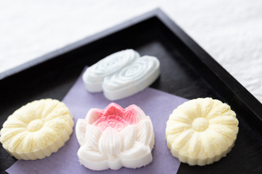 米や小豆、大豆、蕎麦など穀物を製粉し、砂糖や水あめなどを加えて練り、着色したものを木型に押して乾燥させたもの。「打ち物」と呼ばれる干菓子。