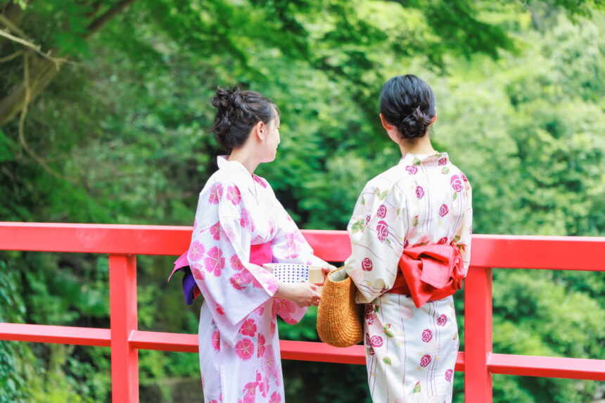 もともとは平安時代の貴族が入浴の時に着る麻の単衣(ひとえ)「湯帷子(ゆかたびら)」を略したもの。江戸時代には、湯上りに着る木綿の着物を指すようになった。湯上りや部屋着、寝間着として使われてきたが、夏祭りや盆踊りでも着るようになった。浴衣といえば、少し前までは白地に藍染、あるいは紺地のものが大半だったが、現在では夏に着るカジュアルな着物として、さまざまな色や柄、着付けで若い世代が楽しむようになっている。