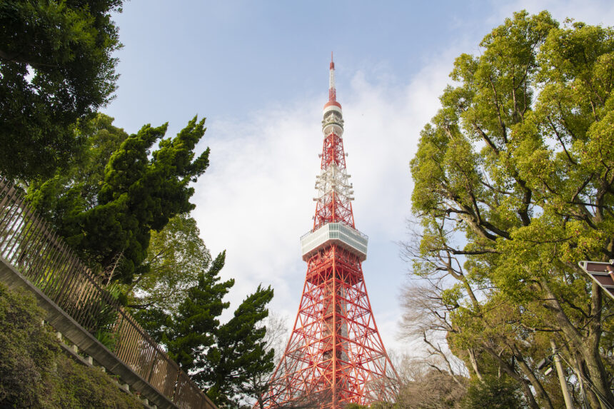 江戸時代のランドマークを参拝した後は、時代をビュンと飛び越えて、昭和の東京を代表するシンボルの元へ。関東地方のテレビ・ラジオの総合電波塔として昭和33年(1958年)に開業した「東京タワー」(地図④)です。高さは333m、建造時は自立式の鉄塔として世界一の高さだったとか。