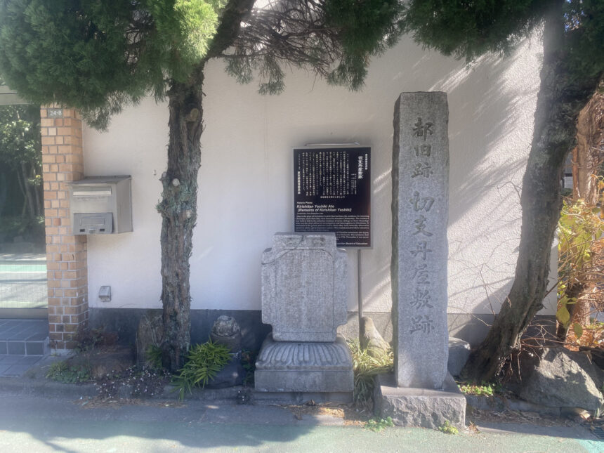 1646(正保3)年、惣目付で宗門改役・井上政重の下屋敷内に牢や番所が建てられ、幕府によって捕らえられたキリシタンの一部が収容されていたことから切支丹屋敷と呼ばれるようになりました。屋敷は1724(享保9)年に火災で焼失後、1792(寛政4)年に廃止されました。時を越えて2014(平成26)年、マンション建設に伴う発掘調査が行われた際、この地で3基の墓とイタリア人収容者のものと推測される遺骨が発見されました。現在は跡地に記念碑が立つほか、拷問にあった八兵衛という信者を生き埋めにして石を置いたといわれる「夜なき石(八兵衛石)」があります。
