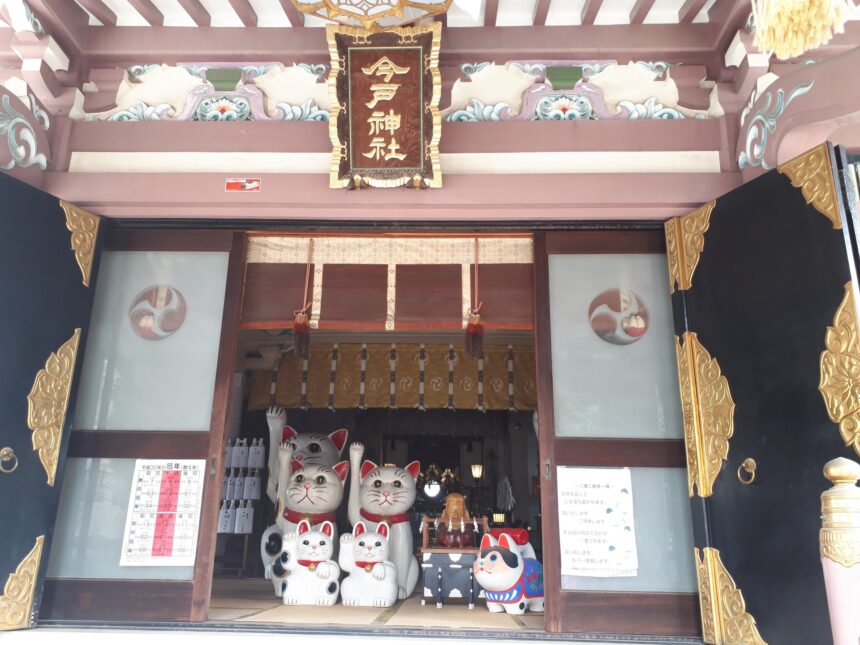日本で最初の夫婦である伊弉諾尊(いざなぎのみこと)と伊弉冉尊(いざなみのみこと)を祀っており、縁結びで有名な神社。本殿の横にある2体の「石なで猫」をなでると福が訪れるといわれています。この周辺はかつて今戸焼の製造が盛んで、招き猫も多く生産されていました。そのため今戸神社は招き猫発祥の地ともいわれており、境内ではたくさんの招き猫を見ることができます。運が良ければこの近くに住む“生きた招き猫”の白猫「なみちゃん」に会えるかも?猫のお守りや御朱印帳なども販売されているので、猫愛好家も多く訪れています。