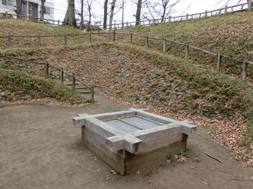 日本有数の規模を持つ井戸で、大井戸公園内にあります。水事情の悪い武蔵野台地で地中深くから水を得るため、すり鉢状の大きな穴が掘られ、その底に井戸が掘られています。武蔵野台地に多い「まいまいず井戸」(まいまい=カタツムリ)に類似した井戸で、中世の開削と推測され、18世紀途中頃まで使用されていたようですが、何らかの理由で埋没して使われなくなったとみられています。1991(平成3)年から数年かけて発掘調査が行われ、その結果にもとづいて復元整備が行われました。東京都指定史跡です。(画像協力=青梅市郷土博物館)