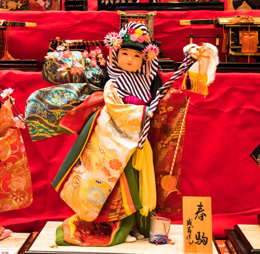 Hariko (papier-mâché. A toy in which a horse’s head, made with a frame made of bamboo or wood, or a mold made of clay and pasted with Japanese paper, is attached to the body of a stick with a wheel at the other end. Children’s New Year’s plaything. The art of “kadozuke” (going from house to house with a harukoma) became popular around the middle of the Edo period (1603-1867), and is still practiced as a folk art in Sado City, Niigata Prefecture, and Koshu City, Yamanashi Prefecture. There are many dancing dolls, court dolls, and feather boards depicting children and women carrying harukoma.