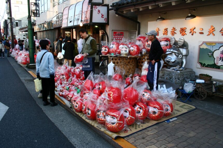 Daruma doll market stands along the old Ome Kaido Road. About 40 stalls sell Daruma dolls. The “Tokyo Daruma (Tama Daruma)” sold at this market is characterized by the gold leaf around the eyes. It also has fewer whiskers than the famous Takasaki Daruma. Daruma dolls range in size from large enough to hold in one’s arms to small enough to fit in one hand, and come in a variety of colors, including blue, yellow, white, and pink. Daruma dolls are handmade by a Daruma shop, from the mold for the base, and the faces are all hand-drawn. The individuality of the craftsman’s skills shines through in this traditional handicraft. Each Daruma doll has a slightly different face, so you can find the one you like best. In addition to Daruma dolls, there will be many stalls selling food and drink.