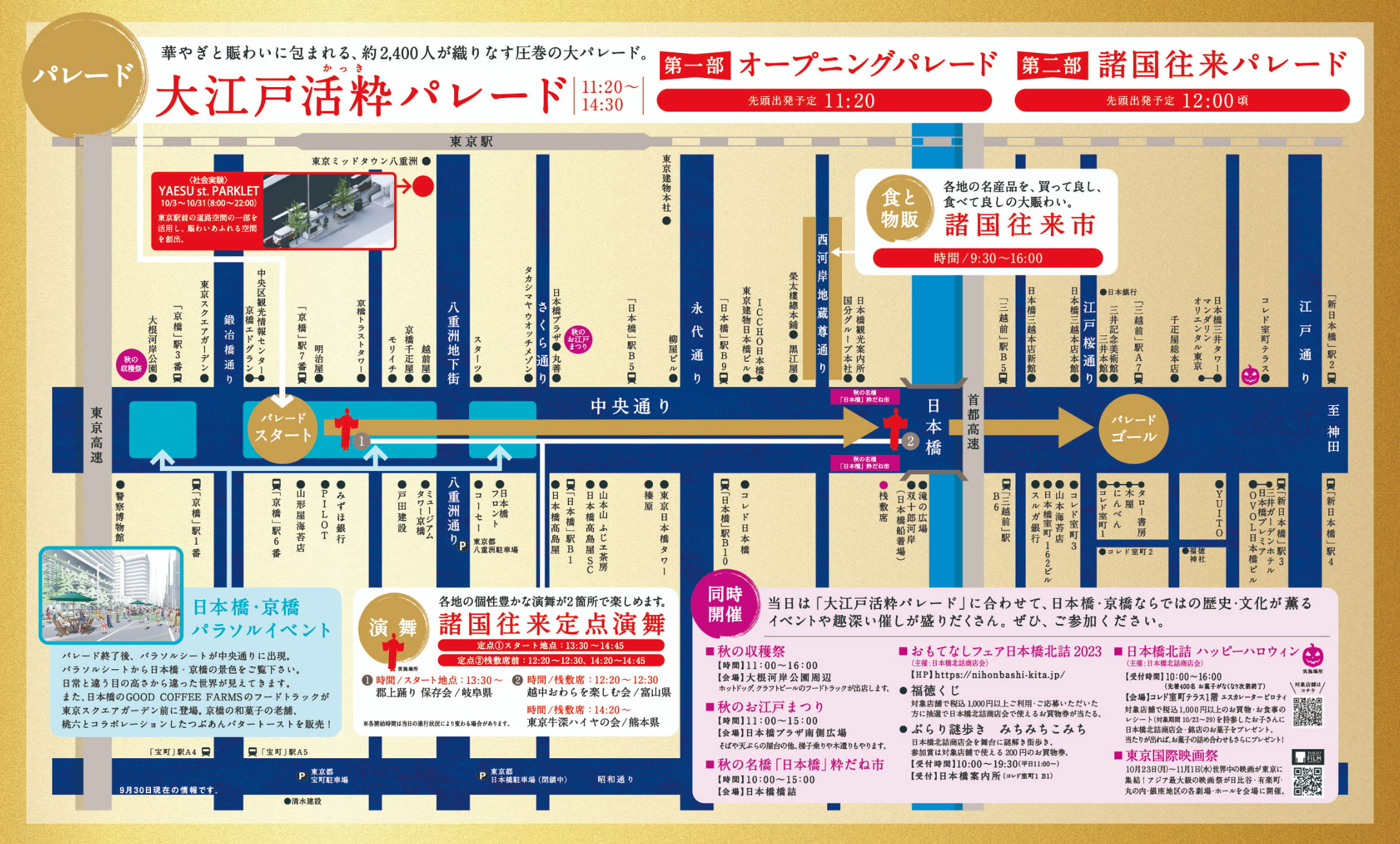 In addition to the “Oedo Kasshiki Parade,” in which approximately 2,000 people fill Chuo-dori Avenue in Nihonbashi, the starting point of the Five Streets, the festival will also feature the “Provincial Orai Market,” which will bring together specialty products from all over Japan.