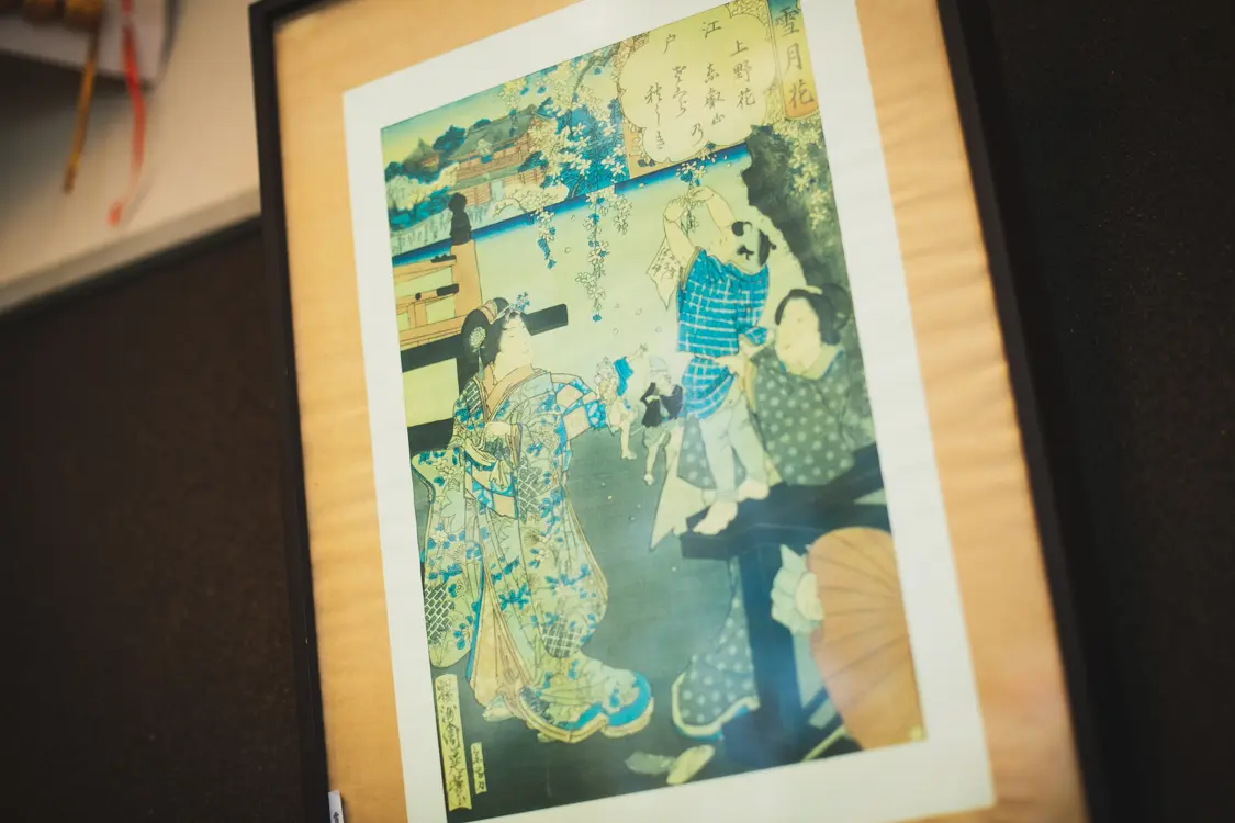 “Shuushiki,” which appears in the shop’s name and confectionery names, was the pen name of O-Aki, born as the shop’s daughter in the Edo period and active as a female haiku poet. At age 13, she visited Ueno Park for cherry-blossom viewing and wrote the poem “By the well, cherry blossoms are dangerous; drunk on sake,” inspired by people drunk on hanami sake. The poem became famous throughout Edo and was even adapted into storytelling performances. In tribute to the poem, the shop’s wrapping paper features charming cherry blossoms. A replica print of “The Woman Shuushiki” is also quietly displayed in a corner of the shop.