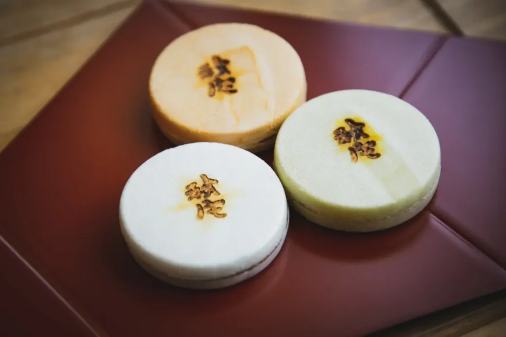 Shuushiki Monaka — Japan’s first three-color monaka, created by the 16th head. “Brown” has Ogura anko with the rich flavor of red beans. “White” is black anko made with Okinawan brown sugar. “Green” is chestnut anko with finely chopped chestnuts mixed into white anko. The anko is carefully prepared by craftsmen using selected domestic ingredients. The crisp, light monaka shell pairs perfectly with the elegant sweetness of the anko.