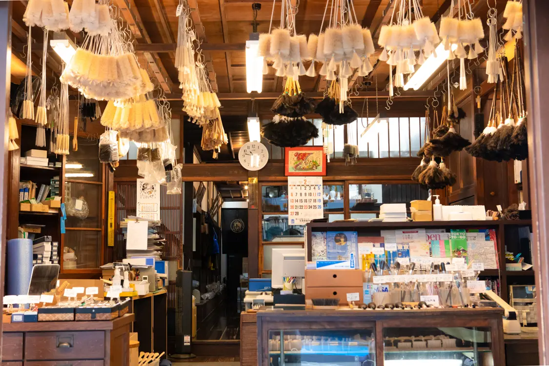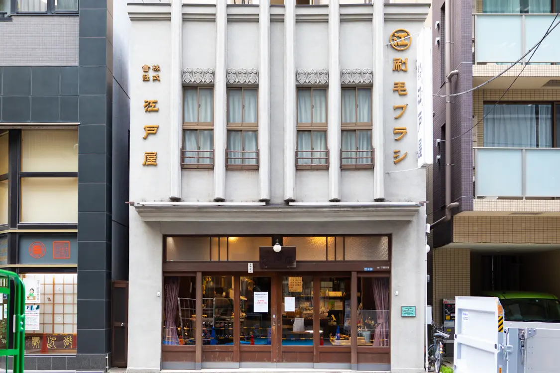 A shop building influenced by Art Deco, standing along the former Nikko Highway in Nihonbashi. It is a Taishō-era structure registered as a National Tangible Cultural Property.特The signboard lettering “Edoya” on the distinctive white artificial-stone exterior shows that each sweeping stroke of the kanji subtly resembles the tip of a brush.Yes—this is a specialty shop for brushes and brooms that has continued since the Edo period.The techniques once used to craft brushes for finishing fusuma and shoji in Edo Castle have expanded into a wide variety of brushes, and continue to be passed down today.