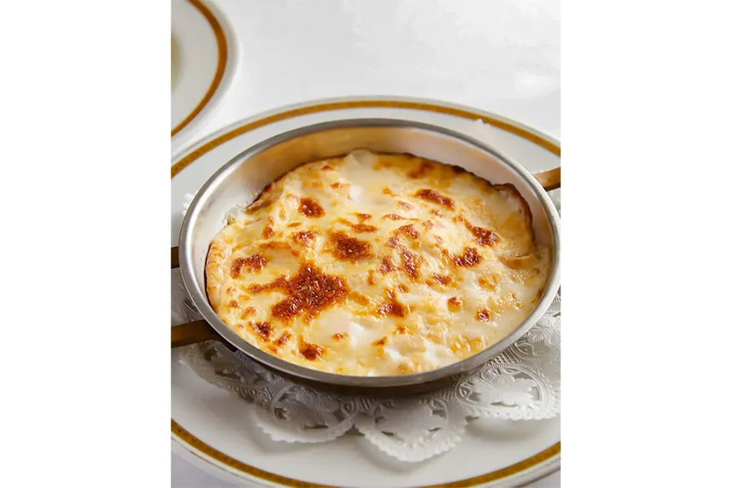 Instead of regular macaroni, a small amount of buttered rice is used, giving it a smooth and light texture.The flavor is simple and gentle, made to suit Japanese tastes.This is a historic dish born from the teachings of Saly Weil.