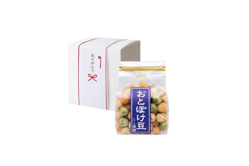 At the time of purchase, customers must select the product content from either 378 yen bean confectionery (otoboke-mame, ume-ochika, wasabi soybeans, white sesame soybeans, black pepper beans) or 432 yen bean confectionery (green tea, coffee nuts, curry beans). The price of this product is the price of the bean confectionery + 54 yen for the box. Personalized imprinting is also available.
