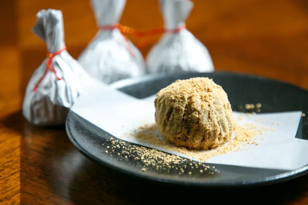 This warabi mochi was designed for easy eating in response to complaints about syrup and kinako spilling when poured over traditional warabi mochi.Its name “Yoshino Tsuyu” comes from the recurring character “喜” in the family line and its texture reminiscent of night dew.Inside the kinako-coated warabi mochi is a smooth Yoshino jelly made by thickening brown sugar syrup with Yoshino kudzu.Each piece is individually wrapped so it can be eaten easily right from the package.