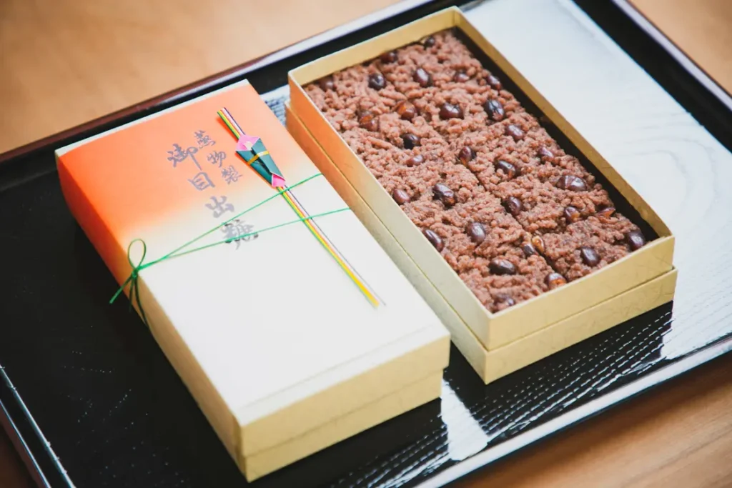 With its red-rice-like appearance and name, it is often chosen for wedding gifts and celebrations and is a signature sweet of Mannendo.Red bean paste is mixed with rice flour and glutinous rice flour into crumbles, topped with candied Dainagon beans, then steamed.It features a rich adzuki flavor and gentle sweetness with a soft, chewy texture.