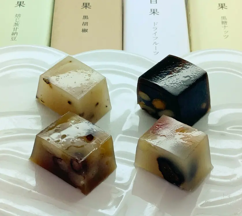 The yokan is filled generously with dried fruits, nuts, and sweet beans.There are four standard flavors—Dried Fruit, Brown Sugar & Nuts, Roasted Tea & Sweet Beans, and Black Pepper—along with seasonal varieties.The cut surface is beautiful, making it a yokan you can enjoy visually.