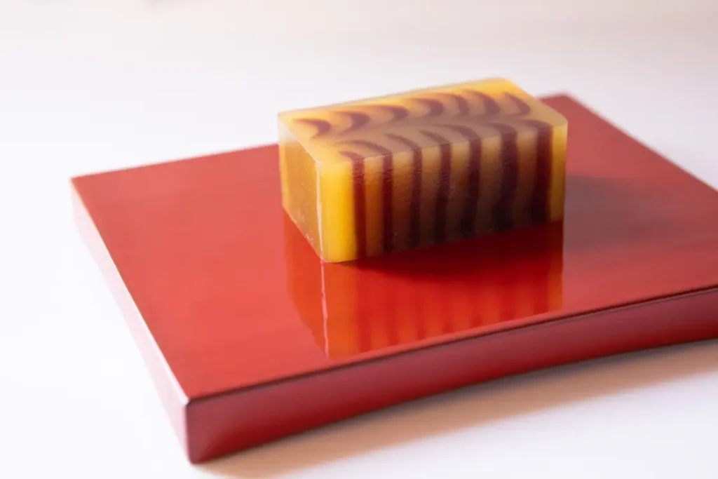 A yokan available exclusively at the Akasaka store. The design features a tiger, Toraya’s symbol, inspired by the saying “travels a thousand li in a day and returns a thousand li.” It has been particularly popular in 2022, the Year of the Tiger. The tiger-stripe pattern made from white-bean yokan and black-bean yokan is created entirely by hand by artisans.
