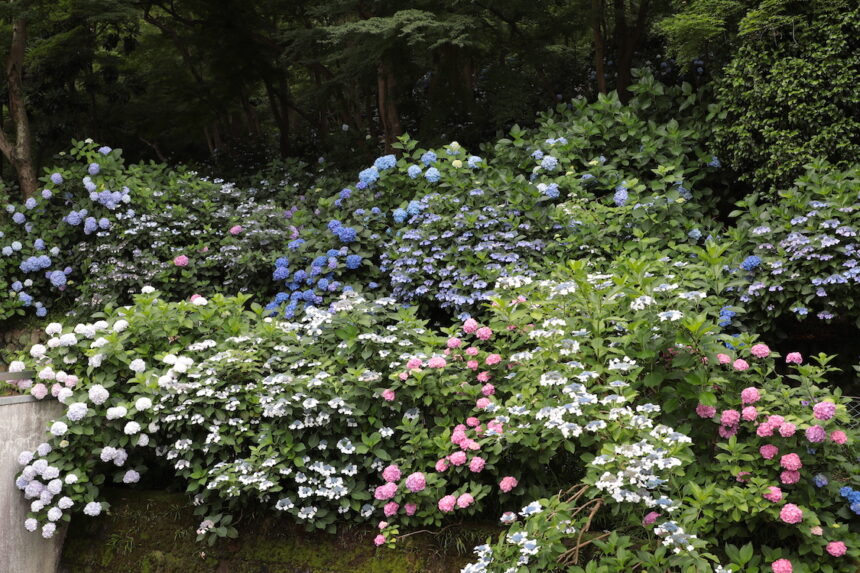 成田山新勝寺などとともに、関東三大不動のひとつとされる、真言宗智山派別格本山の寺院・高幡不動尊金剛寺。6月1日~6月30日に「あじさいまつり」が開催されます。期間中は、西洋あじさいや山あじさいが咲き乱れ、その数約250種類以上、7800株余りと大規模。6月初旬から中旬は山あじさいが、6月中旬から7月初旬は西洋あじさいが見ごろを迎えます。またイベント期間中はあじさい市や植木市(土・日曜)、茶庭拝観、俳句短歌大会などさまざまなイベントも開催されます。