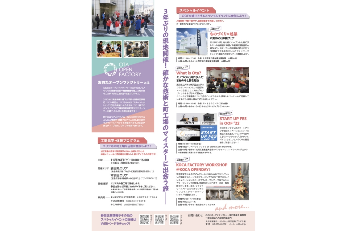 12回目となる2022年は、3年ぶりに現地でのリアル開催を予定。イベント中に各工場を一般公開し、参加者が自由に見学できる時間を設けます。工場公開のほか、大田区のモノづくりの歴史や工場建築の紹介、端材やレーザーカッターを使用するワークショップも行います。オンラインでも工場紹介コンテンツが視聴可能です。