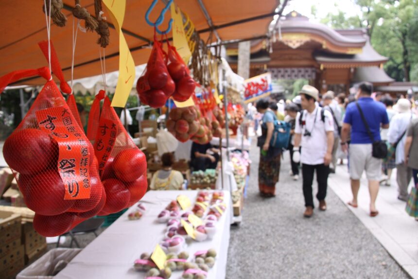 毎年7月20日、東京都府中市にある大國魂神社で開催される「すもも祭」。その起源は源頼義・義家父子が、奥州安倍氏平定(前九年の役)の途中に、大國魂神社に戦勝祈願をしたところ、見事、戦に勝利し、凱旋の帰途でも戦勝御礼詣りをしたと伝わります。その際、神様へのお供え物の一つとしてすももを供え、境内にすもも市がたつようになったのが、すもも祭の始まりと言われています。