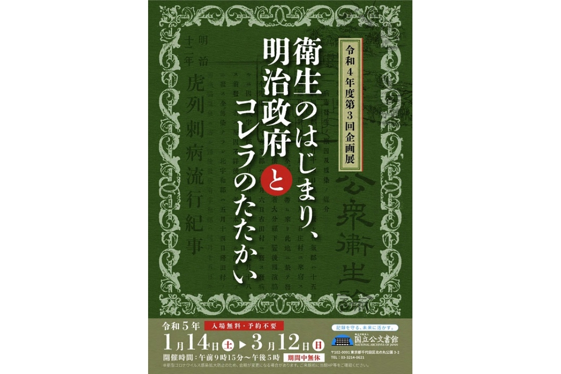 本展では、衛生行政のはじまりと、コレラに立ち向かう政府の様子、そして、コレラ以外も対象としたより広い伝染病の予防に関する制度が確立するまでをご紹介します。