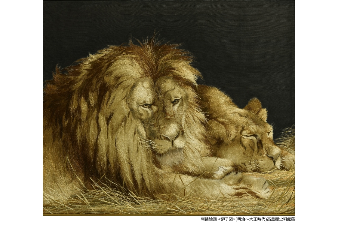 刺繍絵画とは、日本画家が描いた下絵をもとに、刺繍職人が針と糸で縫い上げた絵画を、壁掛や衝立などに仕立て製品としたもの。明治・大正期を中心に日本を代表する美術工芸品として数多く製作されました。職人が一針一針、緻密に縫い上げることを繰り返しながら、自由自在に曲線を描き完成させたもので、日本刺繍の最高峰とも評されています。当時、海外の邸宅に飾られる室内装飾品として輸出されたり、万国博覧会にも出品されるなどし、その多くが海外に渡ったままです。本展では、日本にある貴重な刺繍絵画作品を中心に、ビロード友禅やそれらの下絵を展示。また必見作品のひとつ「獅子図」は、日本画家の神坂松濤が描いた「獅子図」が下絵となった作品です。