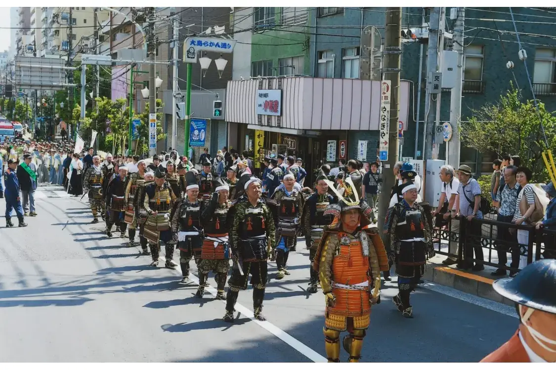 必見は、藤原秀郷が参詣する様子を再現した武者行列。鎧兜の装束や陣羽織、裃などを身にまとった地元の子どもや氏子たちが、13時に江東区大島3丁目にある亀出神社から出発し、亀戸香取神社までの2kmを練り歩きます。