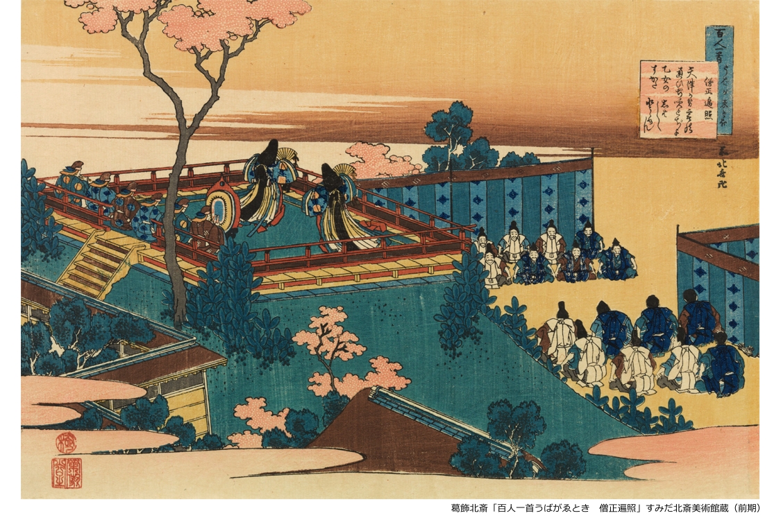 江戸時代中期までに一般教養として広まった百人一首。葛飾北斎の最後の大判錦絵シリーズ『百人一首乳母かゑとき(ひゃくにんいっしゅうばがえとき)』は、百人一首の歌を絵にしてその内容を解説する主旨で27図が出版されました。いずれも、歌や歌人の一般的なイメージに北斎独自の発想を盛り込み、北斎ならではの世界観が表現されています。本展では同館が所蔵する『百人一首乳母かゑとき』シリーズ23図を中心に、北斎と門人たちが描いた百人一首にまつわる作品を幅広く展示します。