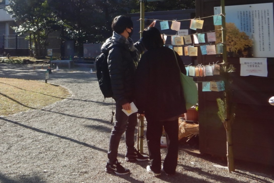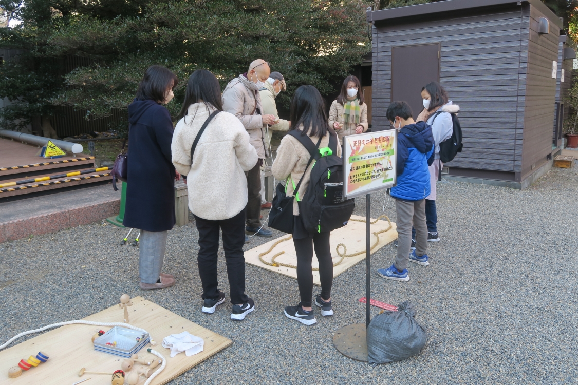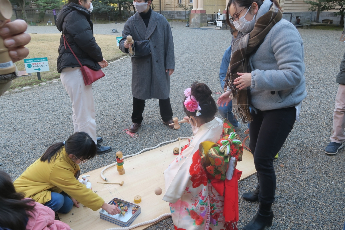 また、庭園窓口横エリアでは、旧岩崎邸オリジナルのウィッシングカードに新年の抱負や夢、願いごとなどを書いて、ブースに掛けることができるスペースを用意。和館では、抹茶と上生菓子のセット(850円)の提供も。洋館車廻し周辺では、独楽まわしや輪投げなど昔ながらの子どもの遊びを楽しめます。