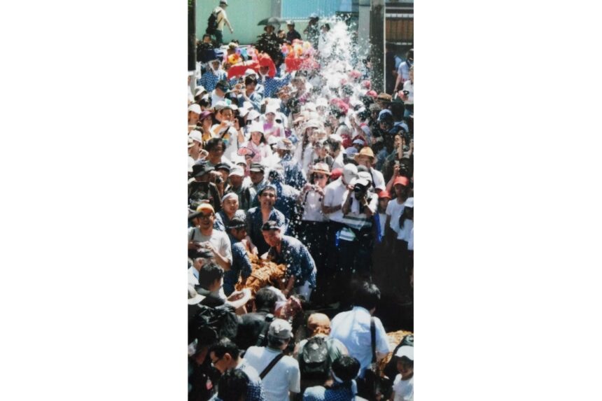 毎年7月第2日曜(2022年は7月10日)13時、「道行」という雨乞いの儀式からスタートします。わらで編んだ縄を渦巻き状に巻きあげた雄雌2匹の龍神の中に大貝を吹く人が入り、水をかけられながら進みます。行列には、龍神のあとに、牡丹が描かれた扇子をかざす少年少女の「警固」、笛頭を先頭にした「笛師連」などが続きます。