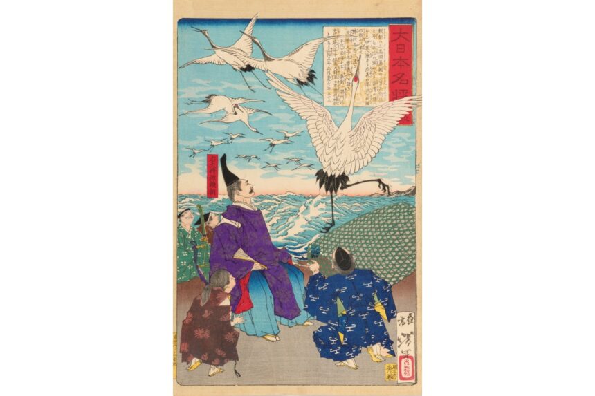 本展の注目作品は、月岡芳年による「大日本名将鑑 右大将源頼朝」。大きく羽を広げ、鶴の群れが空へと飛び立つ様子を源頼朝が見守っているさまを描いたもので、頼朝の心境や時代背景を感じ取ることができます。
