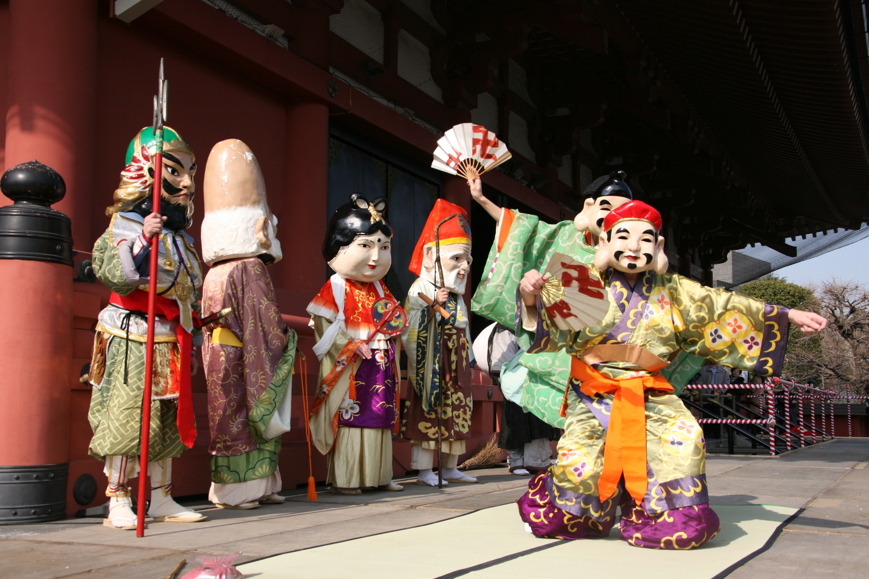 その後、「七福神の舞」が奉演されます。観音様の福徳を讃えるための舞で、恵比須・大黒・毘沙門・弁天・福禄寿・寿老人・布袋の七福神に模した人が舞います。この舞の発端は、昭和39年(1964年)4月の宝蔵門落慶を記念して、端午の節句に奉演される「宝の舞」とともに、「福聚の舞」として始まりました。七福神の舞のほかに、浅草寺幼稚園園児による豆撒きや、「浅草観音文化芸能人節分会」といった行事も行われます。
