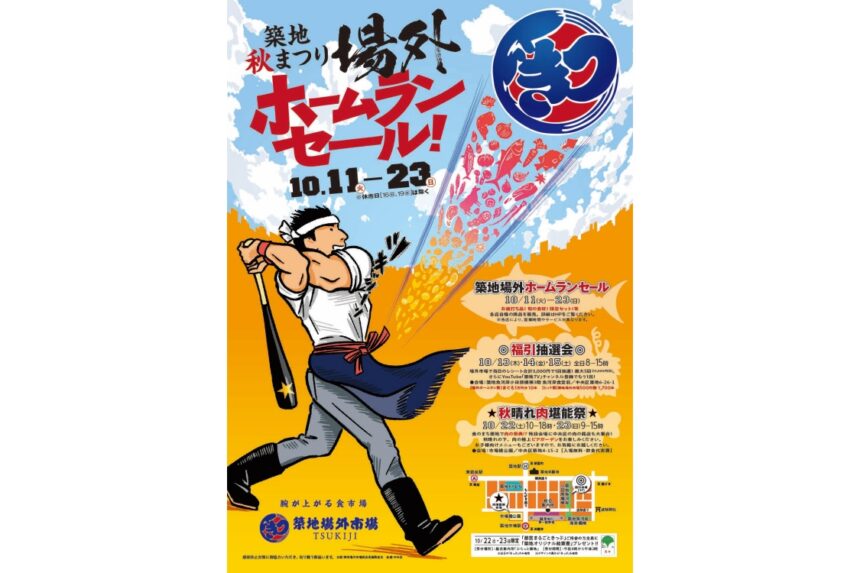 特設会場に築地の店舗や中央区の肉の銘店らが集合し、肉の極上ビアガーデンを楽しめる「秋晴れ肉堪能祭」やお値打ち品や限定セットなど各店自慢の商品を販売する「場外ホームランセール」など、食べて買って楽しめる企画がもりだくさん。また、レシート合算3,000円で1回できる「福引抽選会」では、運がよければ、「場外ホームラン賞」はまぐろ1万円分、「ヒット賞」はお買い物券500円券などが当たります。「都営まるごときっぷ」を持参している人には、築地オリジナル絵葉書をプレゼント。
