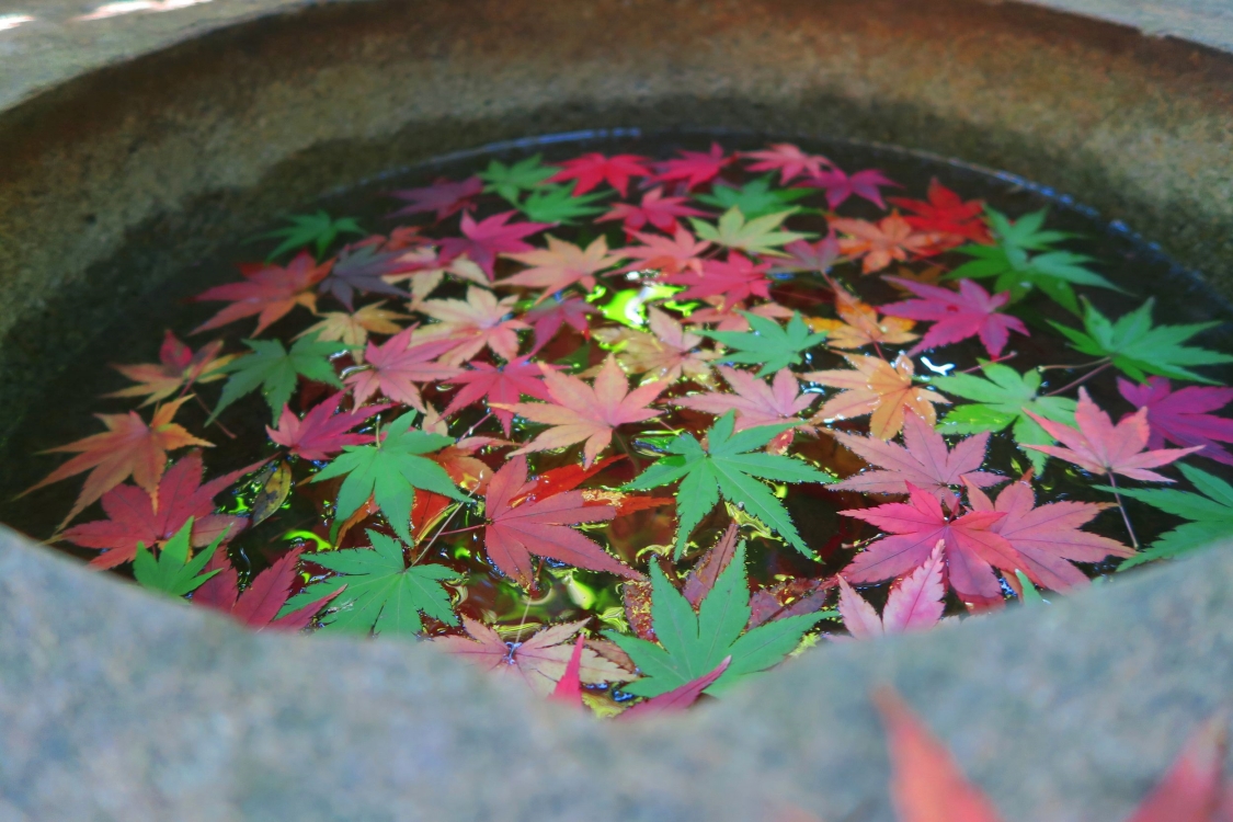 色づいた紅葉とともに秋バラを観賞