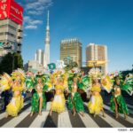華やかなビル群を背に神輿が盛大に練り歩く
