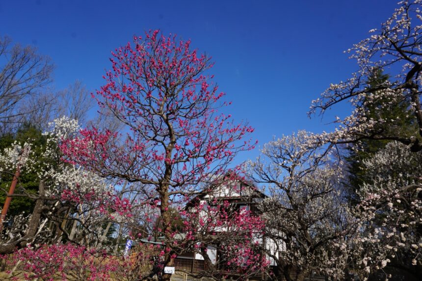 府中市郷土の森博物館では、梅の開花シーズンになると、福岡にある太宰府天満宮から贈られた紅白の梅をはじめ、八重寒紅や白牡丹、唐梅など、約120種1,300本の梅が満開に。梅まつり期間中は野点茶会、大道芸、職人芸、梅に関する俳句の募集などイベントがたくさん。