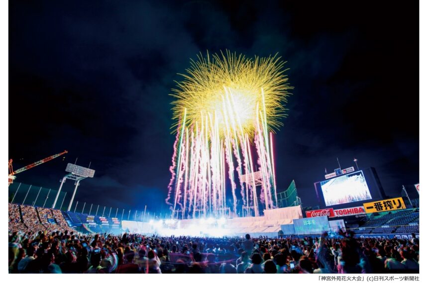 東京2大花火大会のひとつとされる「神宮外苑花火大会」。会場周辺も含め毎年約100万人が訪れる一大イベントで、有名アーティストのライブとともに12,000発もの迫力ある花火を楽しめます。会場は神宮球場・秩父宮ラグビー場・神宮軟式球場の3か所で、どの会場からも迫力満点の花火を観覧できます。