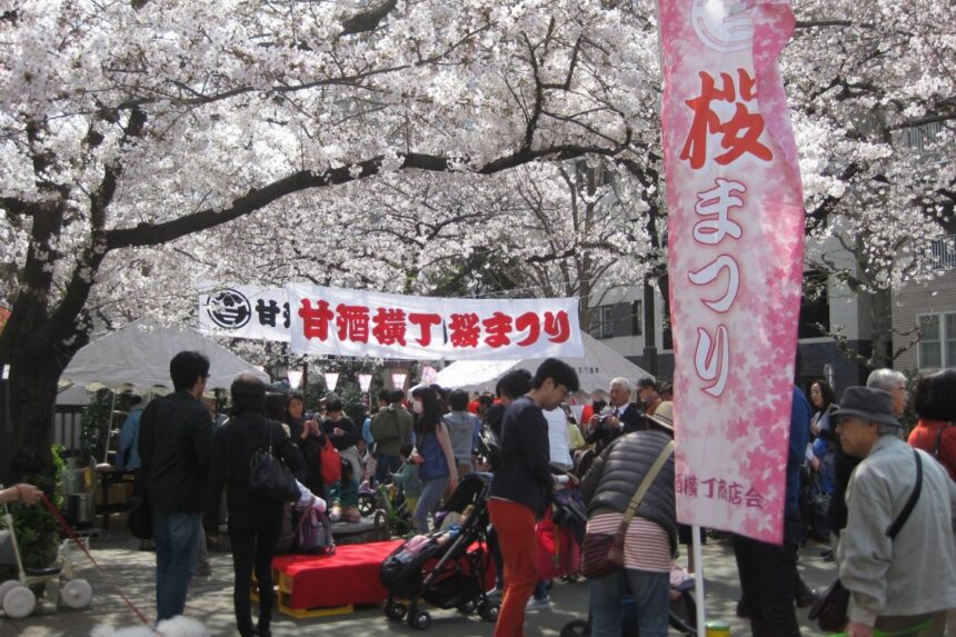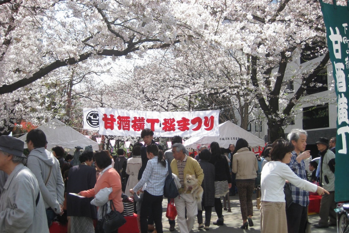 日本橋人形町にある甘酒横丁に交差する浜町緑道は、ソメイヨシノやオオシマザクラの並木道があり、開花シーズンになると 美しい桜のアーチ目当てに多くの花見客が訪れます。甘酒横丁商店会では、地元の人が作った甘酒2500杯を無料提供。また甘酒横丁で買い物をした時にもらえる券で、名物グルメなどが当たる福引も実施。甘酒横丁名物の商品が当たるということで毎年行列になるそう。甘酒や福引の景品がなくなり次第 終了なので、お早めに。