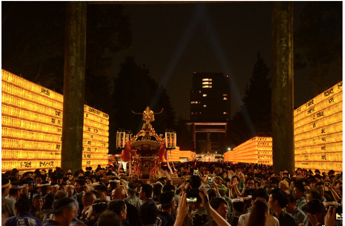 期間中、境内には大小3万を超える提灯、懸雪洞かけぼんぼりが掲げられ、夜を黄金色に彩ります。