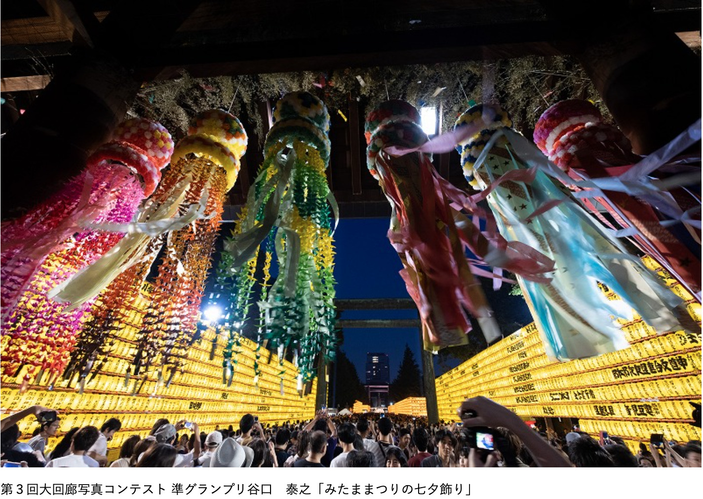 神門には宮城縣護國神社から奉納された仙台七夕飾りが飾られ、写真撮影で賑わいます。