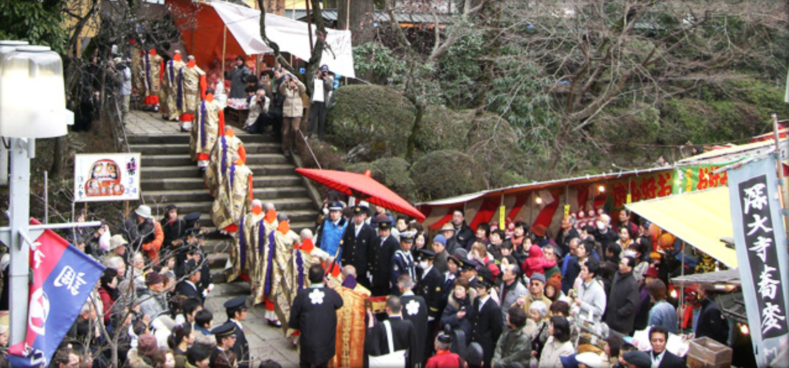 れにあわせて境内では大師様のご威力にあやかる縁起だるま市も開かれます。「日本三大だるま市」の1つとして、また東京に春を呼ぶ深大寺のだるま市としてその知名度は全国的です。寺の境内には大小約300余の縁起だるま店を中心とした店が並びます。