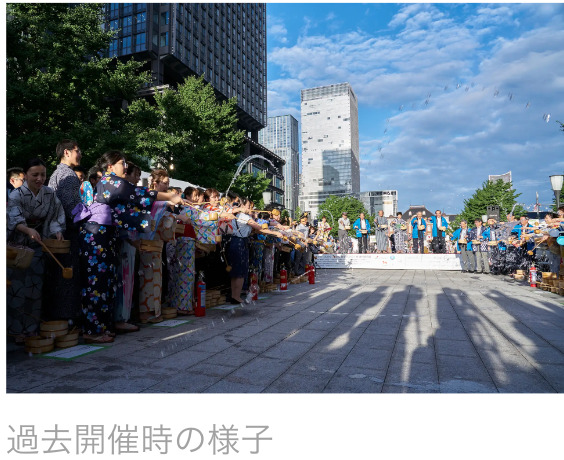 今年で18回目を迎える丸の内エリアの夏の風物詩である「打ち水」を行幸通りにて実施。打ち水で使用する水は、大丸有地区内のビルから排出された中水を利用し、SDGsの観点から参加者の皆様に環境を意識いただく機会を提供します。オープニングイベント終了後も同会場で打ち水を体験することができ、日本古来の涼を楽しむ様子を体感いただけます。