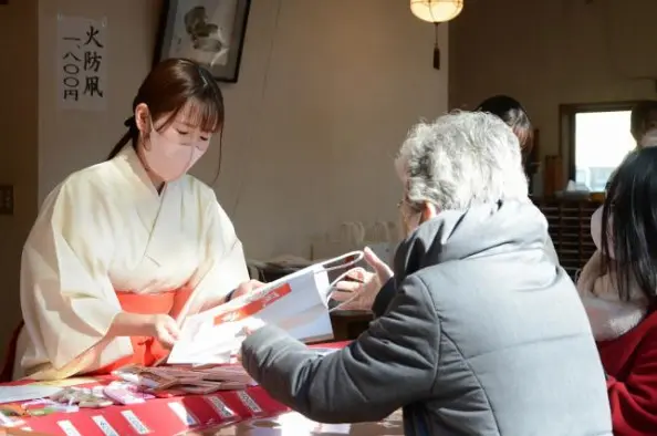同神社を訪れた参拝者は、前年の凧を奉納すると神社にお参りし、境内社務所で改めて「火防の凧」(奴凧型、縦約20cm×横幅約25cm、1体1,800円)を買い求めています。