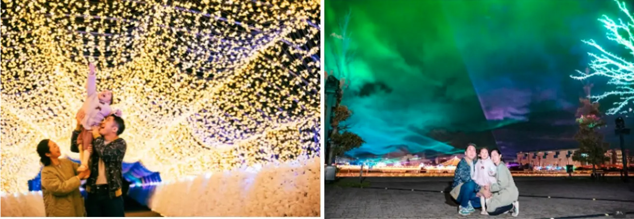 噴水ショーやオーロラ演出、長さ100mの光のトンネルをはじめとした様々なイルミネーションの他、