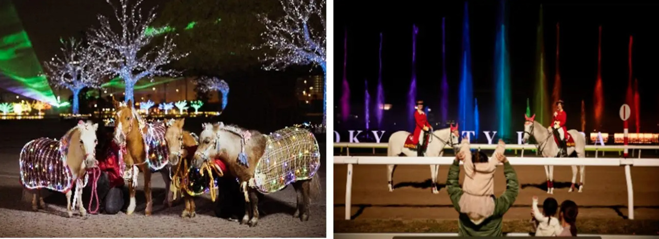 東京メガイルミ(大井競馬場)ならではの企画として大好評の “ミニチュアホース&ポニーとのふれあい” や 、 “噴水×誘導馬のショー” などのお馬さんイベントも充実。
