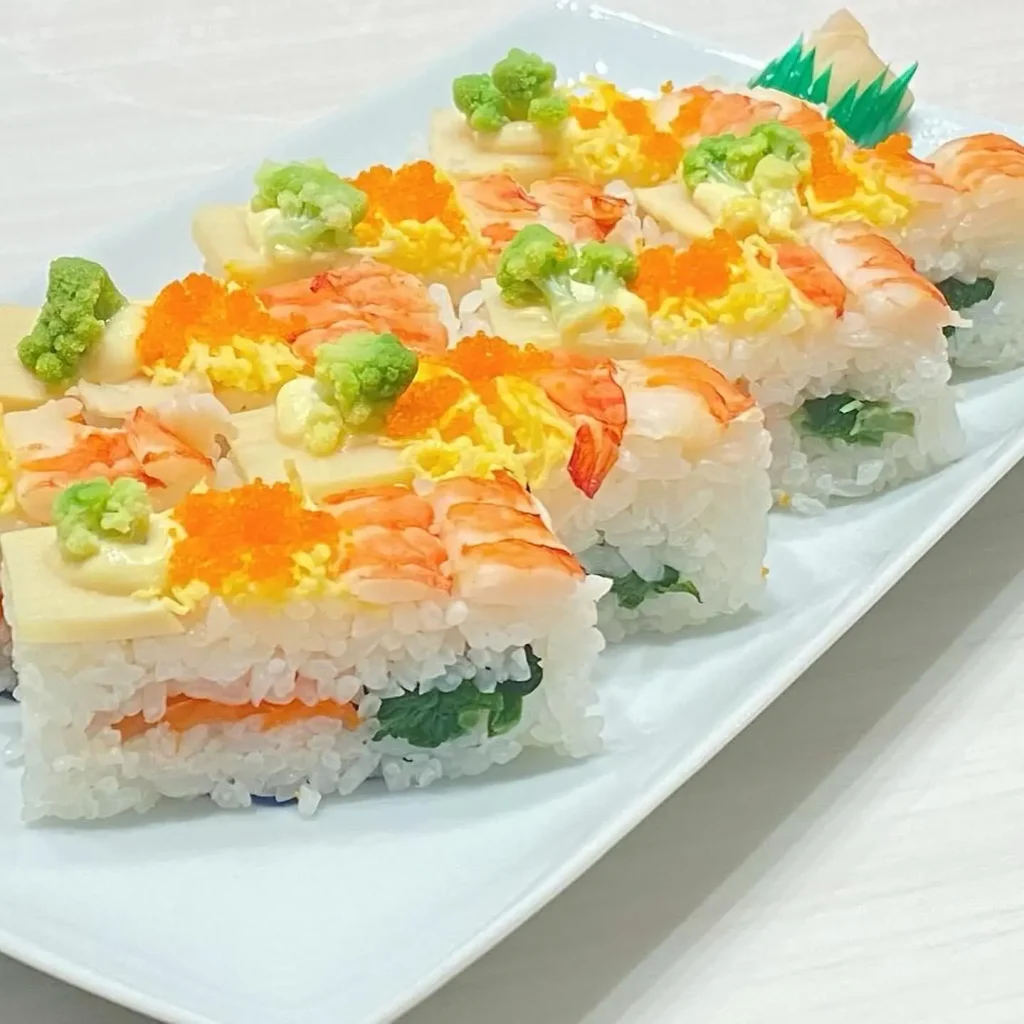 海老、サーモン、菜の花、筍、ロマネスコなど、気持ちが明るくなるような、彩り鮮やかな押し寿司です。