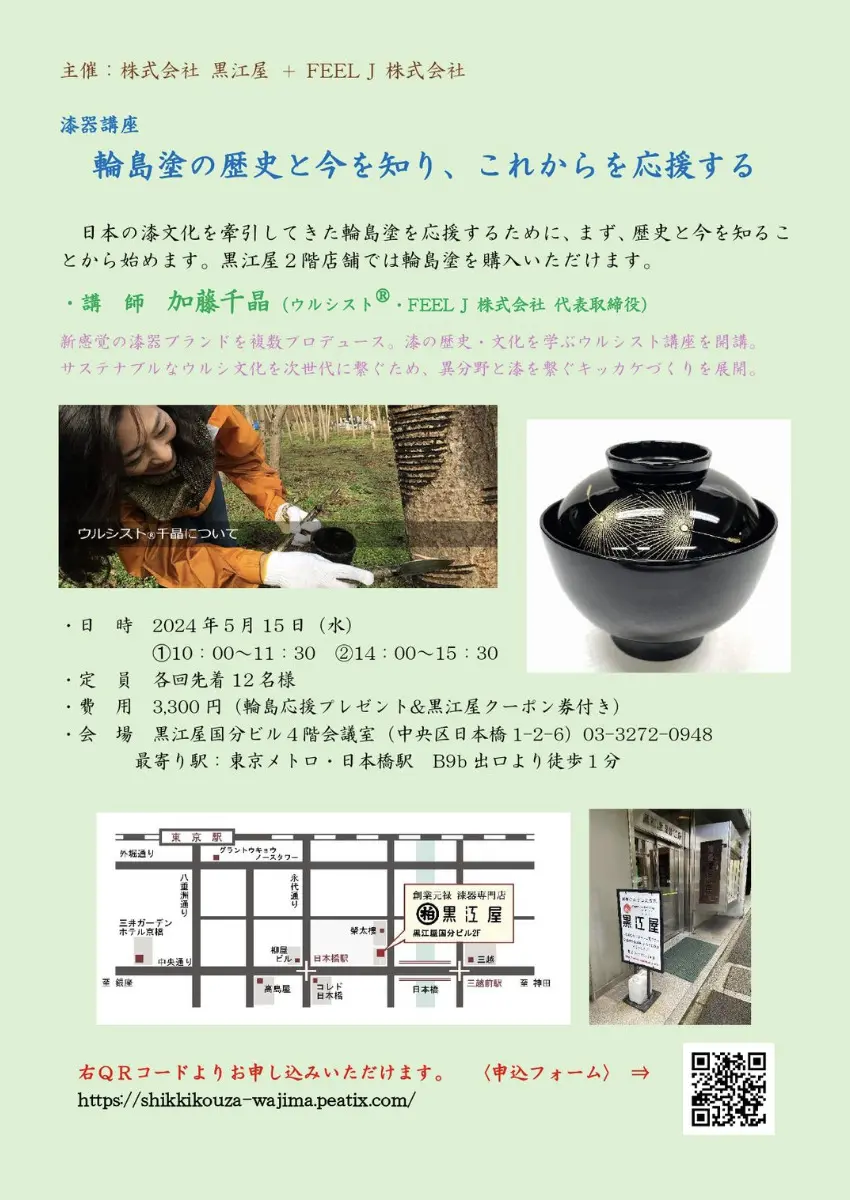 5月15日、東京都中央区日本橋の黒江屋国分ビル4階会議室にて、漆器講座が開催されます。