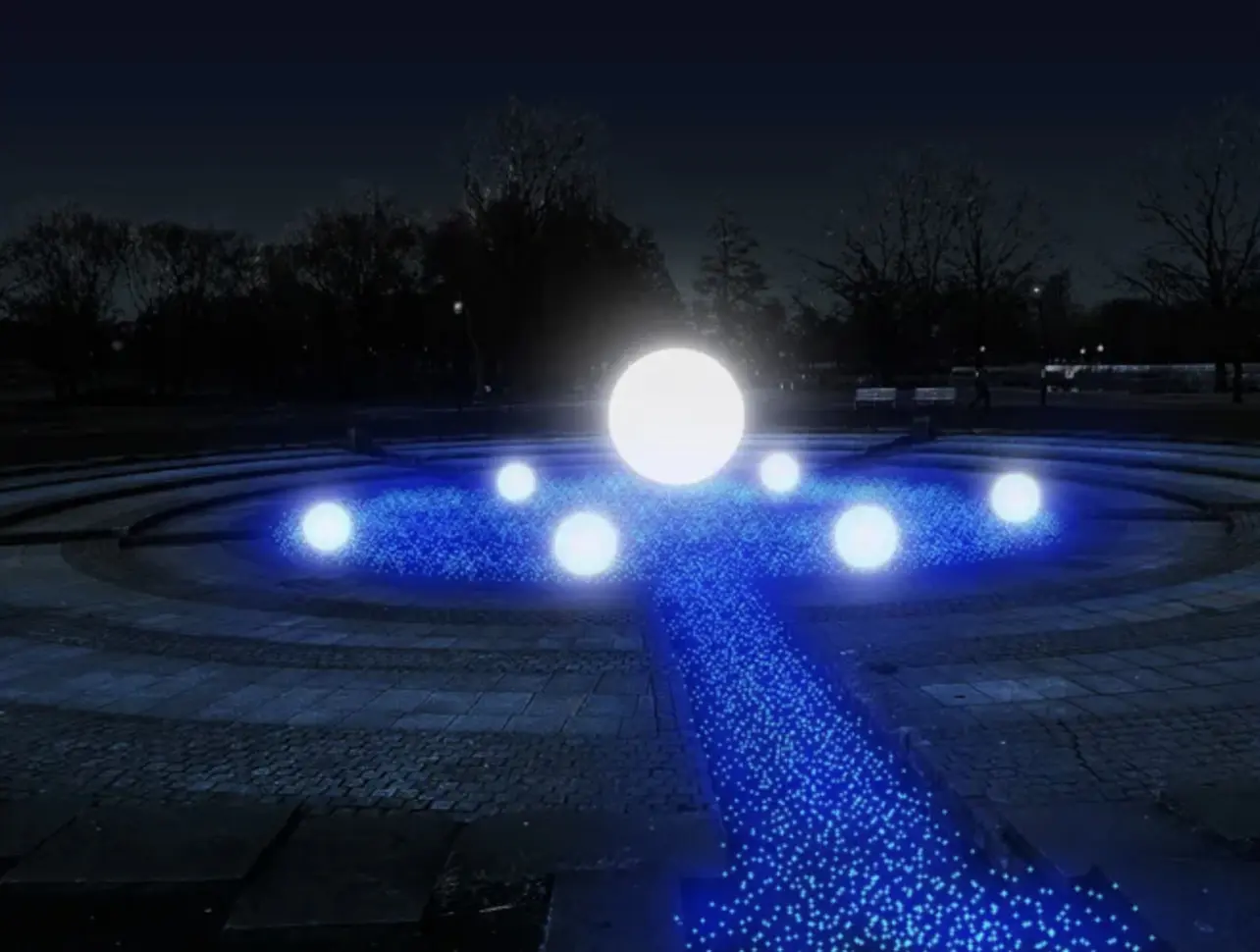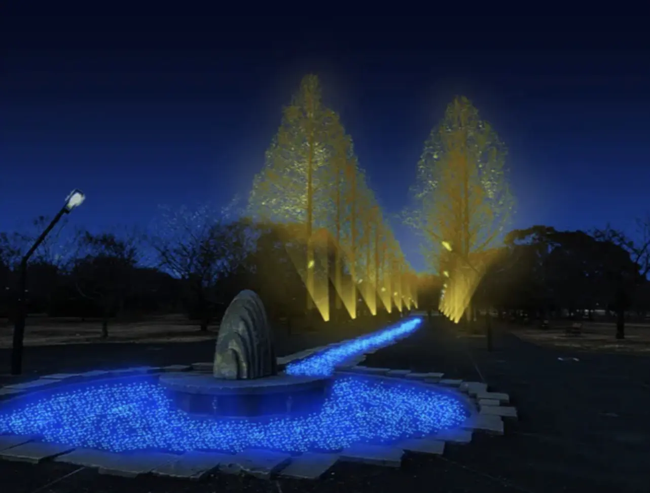 公園入口からネモフィラ花壇までの導線にある噴水や流れは、青色の光でまるで水が流れているかのような演出を行い、ネモフィラ花壇は全体が青色から白色に変化し、波打つ光に包まれるような演出を楽しめます。