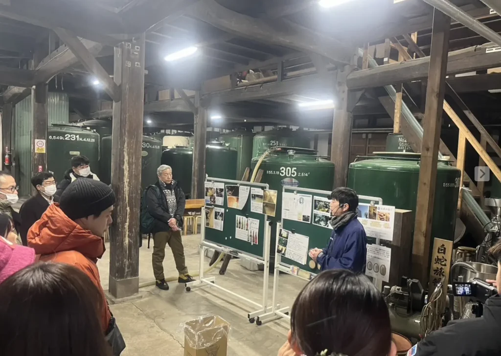 軽妙なトークで、石川酒造が1863年創業、国の登録有形文化財に指定された建造物を6 棟有する歴史ある酒蔵であること、その中で今も酒造りを行っていることを説明してくれました。