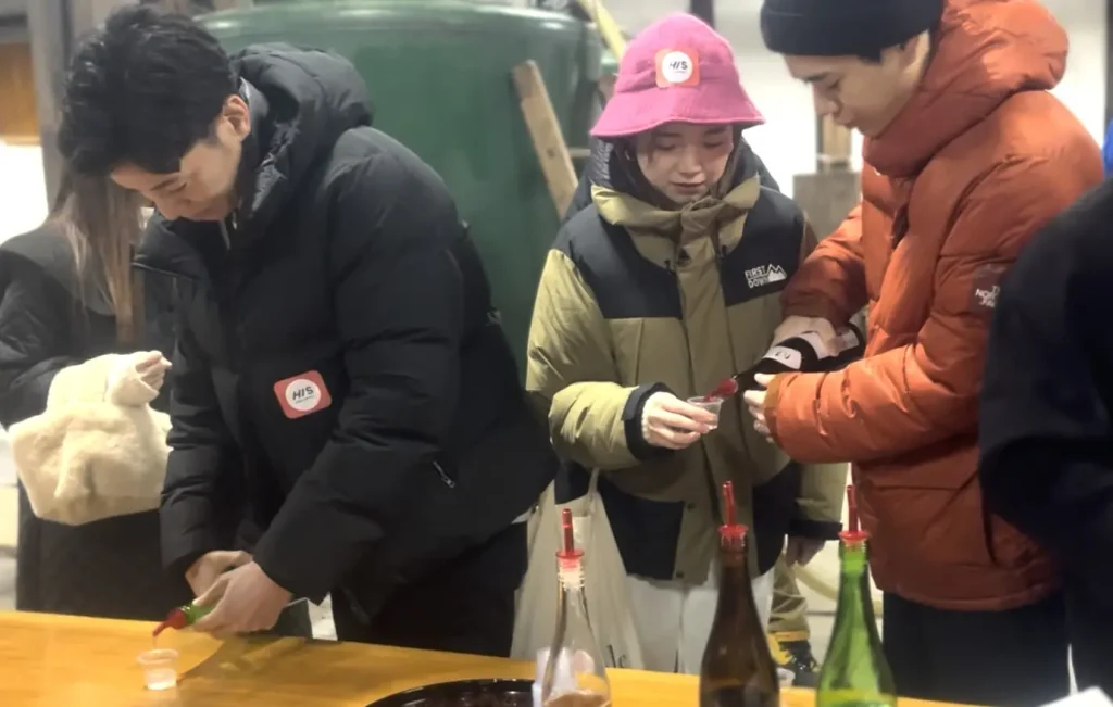 1杯ずつ試飲した後は、みなさん気になるお酒を手酌でおかわり。お土産に買っていくお酒を何にするか、飲みながら選んでいました。